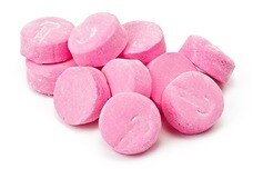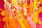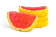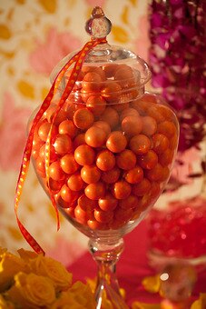 Candy weights (from upper left corner): (1) 8 lbs Orange Shimmer Gum Balls (165 oz container); (2) 5 lbs Peach Gummy Bears (90 oz container); (3) 9 lbs Gummy Pumpkins (151 oz container); (4) 4 lbs Pink Sanding Sugar (130 oz); (5) 8 lbs Hot Pink M&Ms (140 oz container); (6) 8 lbs Gummy Peaches and 7 lbs Gummy Melon Patch Rings (384 oz container); (7) 7 pieces each of Orange Rock Candy Sticks (Unwrapped), Yellow Rock Candy Sticks (Unwrapped), and Light Pink Rock Candy (Unwrapped); (8) 3 lbs Orange Fruit Slices (116 oz container); (9) 1 lb Golden Yellow Sixlets, 2 lbs Jelly Belly Tangerine; 1 lb Pink Shimmer Pearls (75 oz container); (10) 20 orange candy sticks; (11) 11 lbs Wintergreen Lozenges (290 oz container); (12) 5 lbs Grapefruit Fruit Slices (490 oz container)