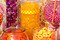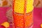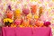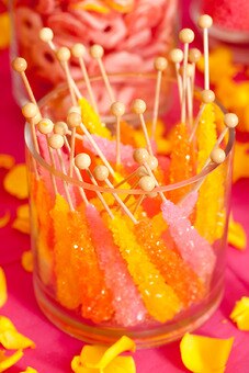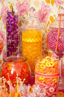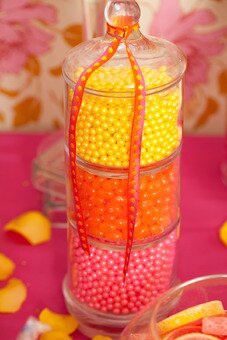 Vibrant orange and yellow hues play together nicely with pink in this hot pink candy buffet. The display is flanked by orchids floating in tall vases of water, and plenty of small, color-coordinated details. Buffet tip: Add small touches, like ribbons, flower petals, and flowers to make your buffet more visually interesting.