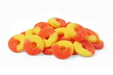 Candy weights (from upper left corner): (1) 7 lbs Diced Coconut; (2) 10 lbs White M&Ms (175 oz container); (3) 10 pieces Tangerine Candy Sticks; (4) 1 lb Twizzlers (Licorice) (125 oz container); (5) 5 lbs Orange Shimmer Gum Balls (140 oz container); (6) 3 lbs Candy Caviar (50 oz container); (7) 5 lbs Orange Fruit Slices (125 oz container); (8) 9 oz Orange Slices (200 oz container); (9) 10 pcs Orange Rock Candy Sticks (Unwrapped); (10) 6 lbs Gummy Peaches (225 oz container); (11) 3 lbs White Chocolate Chips (105 oz container); (12) 5 lbs Black Finnish Licorice (116 oz container); (13) 3 lbs Black Gum Balls (140 oz container); (14) 3 lbs Jelly Belly Tangerine (50 oz container); (15) 4 lbs Sugar-Free Creamsicle Chews (157 oz container); (16) 7 lbs Mochi Rice Cakes (Black Sesame) (170 oz container)
